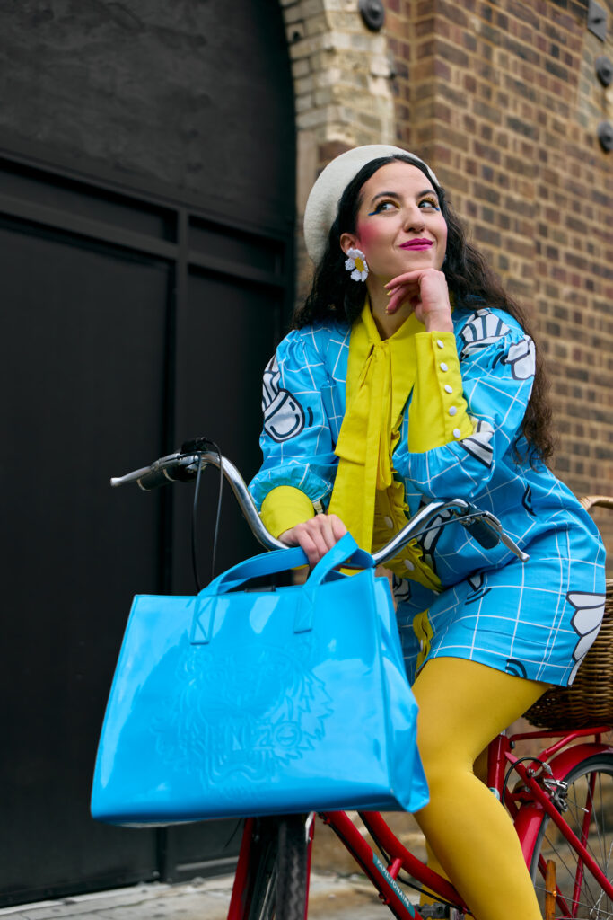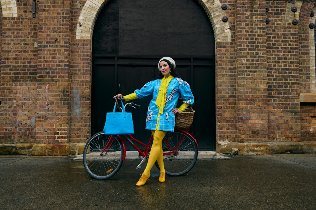 First off we have Sydney Based Anahí Sanz. Using a sustainable mode of transport through the whole week of fashion sporting a bright blue and yellow outfit for Thursdays runways!