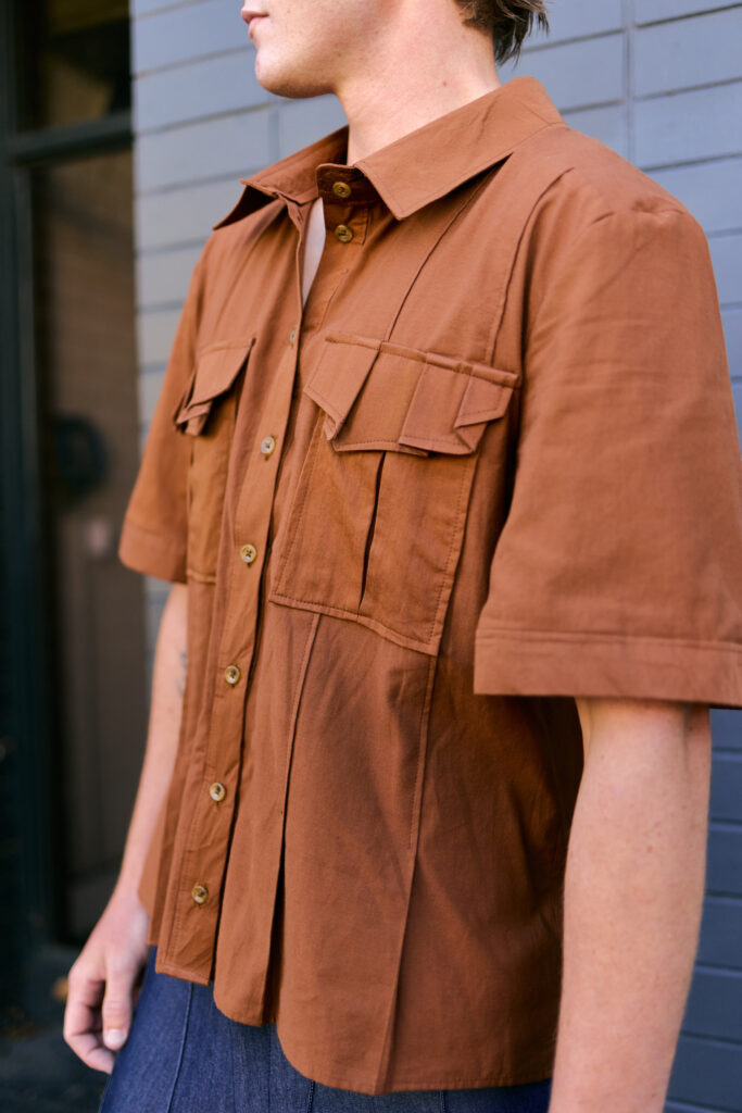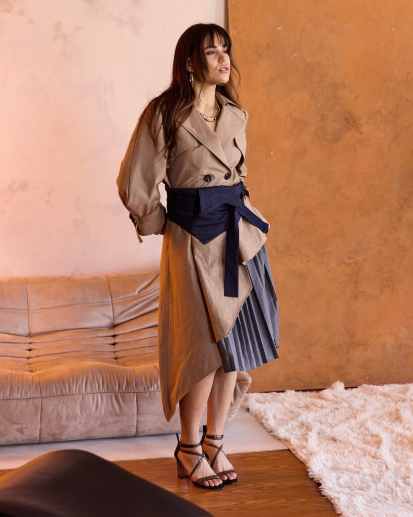 Both designs titled “Origami Jacket and Shorts” and “Trench Coat Dress” are crafted entirely from sustainably sourced fabrics. The brown fabric used for the pockets and collar, have been dyed with used coffee beans sourced from her home country of Japan.